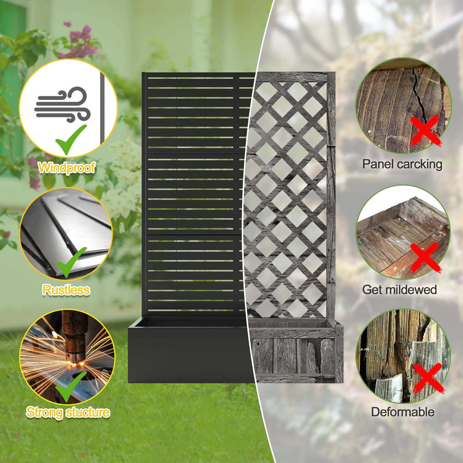 • Versatile Design: This metal planter with a trellis serves multiple purposes, making it the ideal choice for your garden. Use it as a beautiful flower stand or as an outdoor privacy screen.
