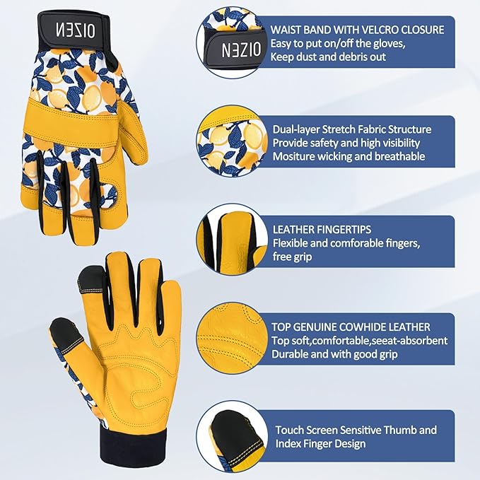 • Ergonomics Design: Stretchable double-layer spandex back keep your hands flexible, breathable & comfortable on the job. Cowhide leather with foam padded palm and reinforced fingertips increase durability. Supportive adjustable with hook & loop strips closure cuff for snug secure fit.