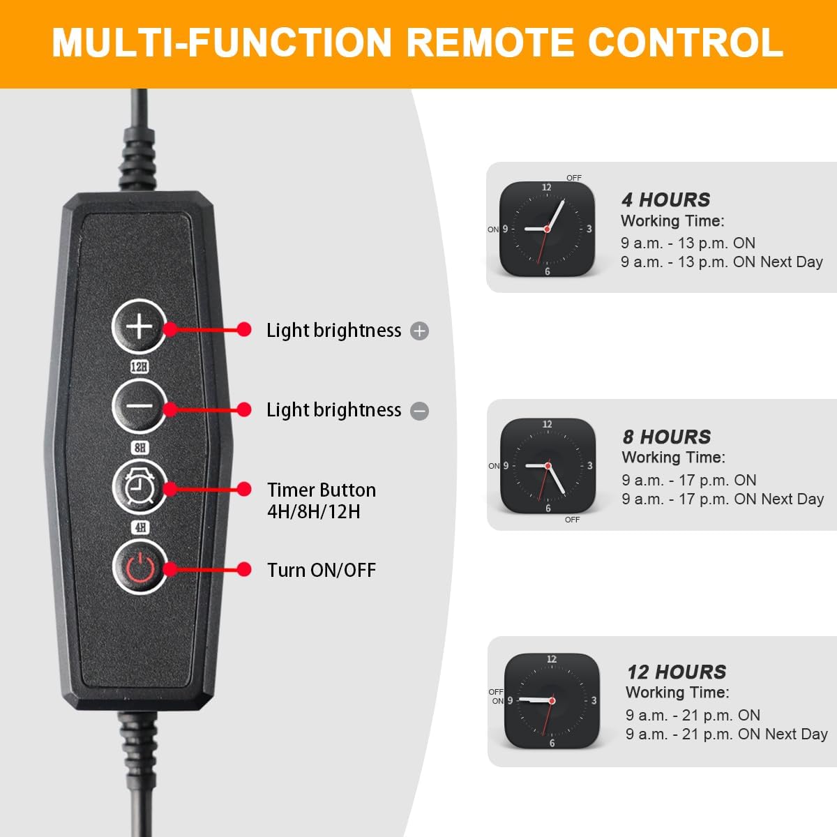 • A Versatile Controller: This growth light offers 3 timing options, enables you to keep the light on for 4/8/12 hrs. It is supposed to last for 2000 cycles and only needs electricity $2.00 (12 hrs/day) every month. That's a good value for the cost. In addition, you can adjust the brightness according to your needs.