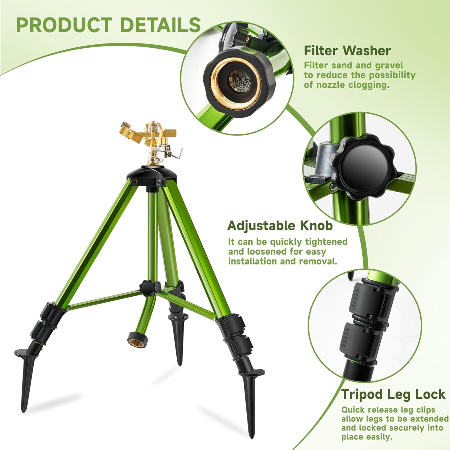 • 【Robust Bottom Design】The bottom design is more conducive to insertion into the soil,and the sprinkler will be very stable when working and will not tip over,despite the high water pressure,and protecting the tripod from corrosion.