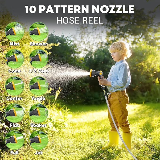 • 【180° Swivel for Total Coverage】Featuring a heavy-duty swivel bracket with a full 180° rotation, this hose reel helps you water hard-to-reach areas with ease. Perfect for lawns, flower beds, patios, and hanging plants—never compromise on coverage again.