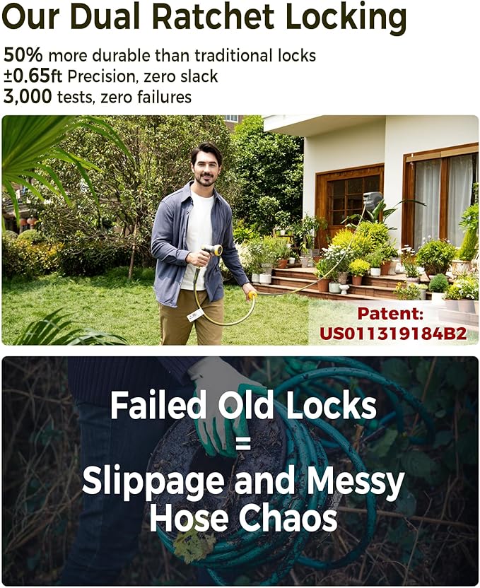 - Precision Dual Ratchet Locking (Patent: US011319184B2): GLAHODEN's auto rewind water hose reel passes 3,000 rigorous tests with ±0.65 ft locking accuracy. 50% more durable than traditional locks, it eliminates hose slack and secures exact lengths, ensuring precise positioning at balcony corners or garden edges without dragging excess hose