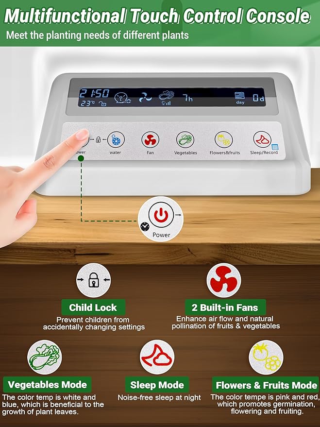 - 【Sleek Design & User-Friendly】 The Growell hydroponics growing system features a large 5.4-inch screen that provides clear and comprehensive data on your hydroponic setup, giving you full control over your plant growth. With its straightforward button settings, even beginners can operate it with ease. Plus, our child lock mode keeps curious kids from accidentally interfering with your hydroponic system settings.