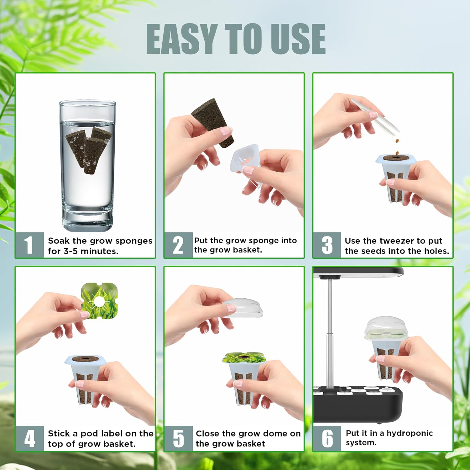 • Square Grow Sponges Kit Contents: You will get 85 Pack Seed Starter Sponges Kit which includes 24 replacement grow sponges + 24 pod stickers + 12 grow baskets + 12 planting domes + 6 T-shaped plant name tags + 6 black plant spacers + 1 tweezers.