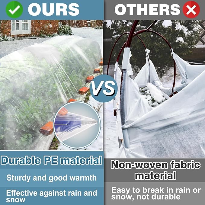 • Excellent Light Transmission: Our plastic sheeting is transparent, allowing light to pass through and ensuring plants receive ample sunlight for healthy growth. Additionally, the transparent cover provides visual access, enabling you to observe the frost protection effect on your plants.
