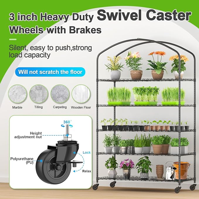 • Easy to Move: With four casters featuring a locking mechanism, you can effortlessly relocate your garden small greenhouse. The polyurethane casters protect your floors, whether they're made of wood, tile, marble, or carpet, from any scratches. Wheels come with height-adjusting nuts to eliminate wobbles from uneven floors. Now you can easily transition your greenhouse from indoors to outdoors or between different rooms.