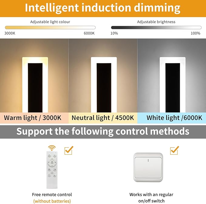 - Memory Function for Modern Wall Sconces: Set your preferred color temperature and brightness and illuminate for 10 seconds or longer (to activate the memory function). The next time you turn on the light, it will retain your previous settings. Note: The wall light supports both wall switch and remote control switch modes, which are not compatible with dimmer switches. The wall switch cannot retain the memory function of the remote control settings.
