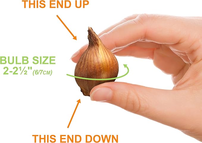 • Product Care Instructions : Plant tulip bulbs in the fall when the ground cools and before the first hard frost. Outside temperature should be about 65 degrees Fahrenheit or cooler. Select a well-drained location that receives full sun to partial shade. Dig a hole 5-6" deep in loosened soil and place bulbs in the hole. Bulbs should be spaced about 4-5” apart. Plant them in the ground with their pointy ends up. Cover with soil and water well so the soil above the bulb settles. Plant tulip bulbs in the fall when the ground cools and before the first hard frost. Outside temperature should be about 65 degrees Fahren… See more