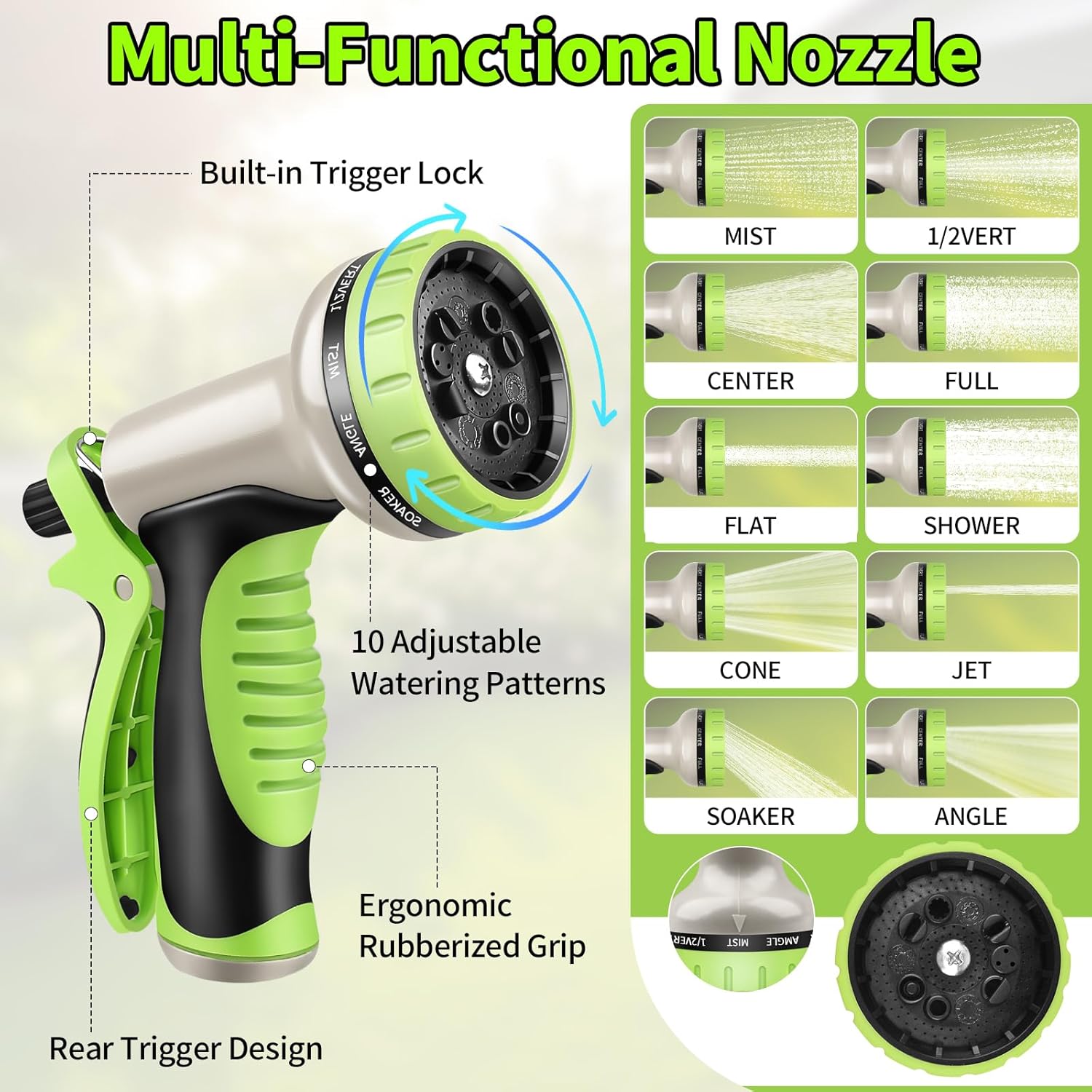• 10-Function Spray Nozzle: This flexible garden hose comes with 10 spray options and leak-proof gaskets, which lets you customize the spray pattern to suit your needs - whether it's for watering your plants, taking care of your lawn, washing your car, or cleaning up after yourself
