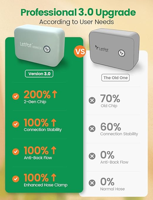 - ๐ฅ [New Upgrades for Superior Performance]: The LetPot automatic watering system now includes an anti-backflow valve to prevent the siphon effect, enhancing watering efficiency. Its upgraded 2.0 chip ensures faster and more stable connectivity, while the LetPot app supports up to 5 simultaneous watering tasks for maximum flexibility. Combined with an advanced spiral lock, it maintains better water pressure retention, ensuring consistent and reliable irrigation every time.