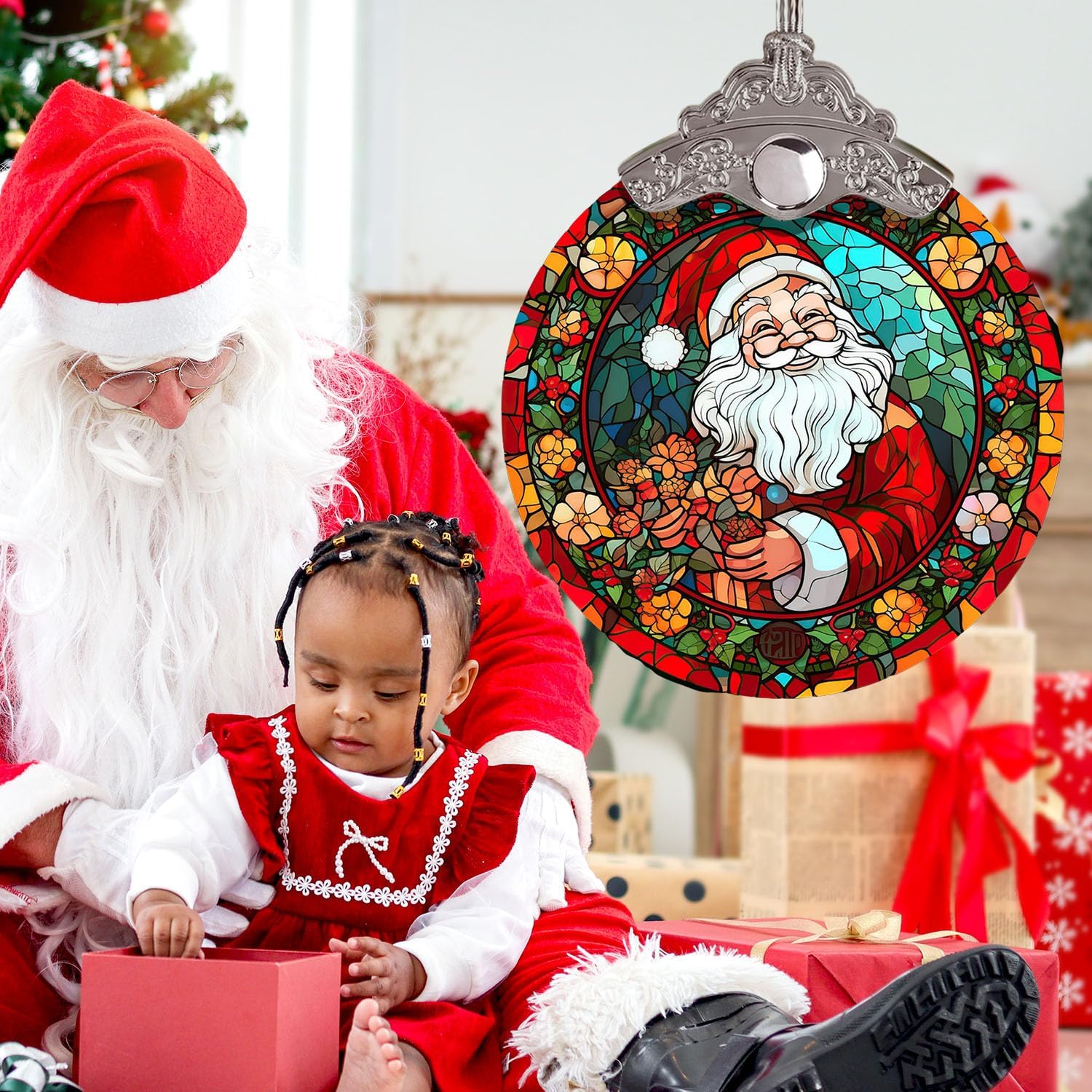 Santa Claus Colorful Christmas Ornament, Stained Glass Xmas Hanging Decor, Retro Style Funny Santa Ornaments Gift
