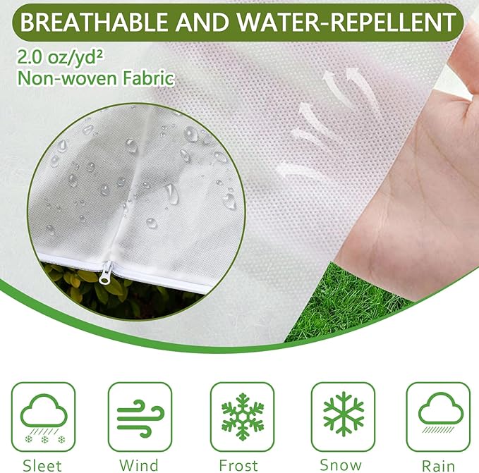 • Breathable and Hydrophobic: The frost covers for outdoor plants are lightweight and breathable, allowing air, water, and sunlight to pass through; Without excessive water penetration, which helps stop freezing and reduces frost wear to plants