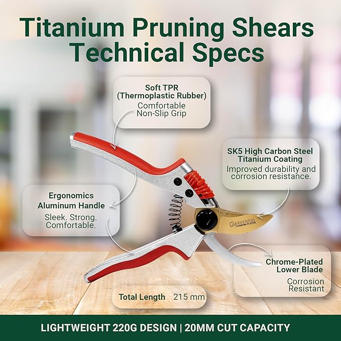 • Precision with Purpose – Crafted with high-carbon SK5 steel, these pruning shears feature dual chrome and titanium plating for exceptional durability and sharpness. Designed to deliver clean, smooth cuts, they support healthy plant growth across a variety of tasks—from trimming delicate flowers to cutting woody stems and small branches.