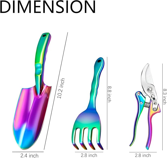 • Vibrant Rainbow Colors: This gardening tool set features a striking rainbow-colored finish that adds a vibrant touch to your gardening tasks.