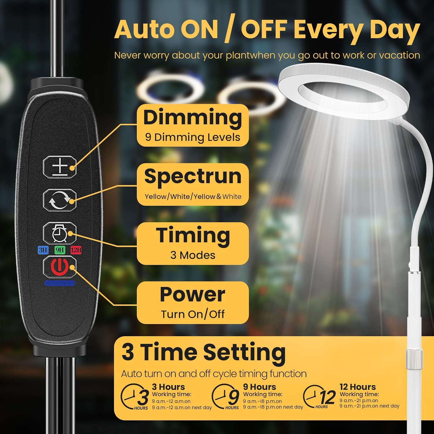 • Three cycle timing settings, this plant light will automatically turn on/off according to your desired schedule every day: 3/9/12H. For example, when keeping the power on, if you choose 9 hours, it will turn on 9 hours every 24 hours.