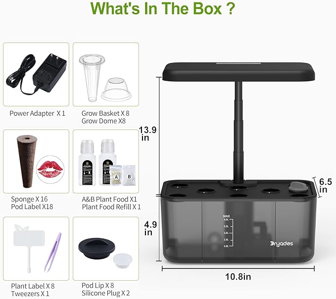 • 【Everything You Need to Start】Your hydroponics growing system kit includes: 1x Grow Machine, 1x Power Adapter, 8x Grow Baskets, 16x Sponges, A&B Nutrient Solutions, 8x Grow Domes, 8x Plant Labels, 1x Tweezers, 8x Pod Lips, 2x Silicone Plugs, and a User Manual. Just add water and your favorite seeds!