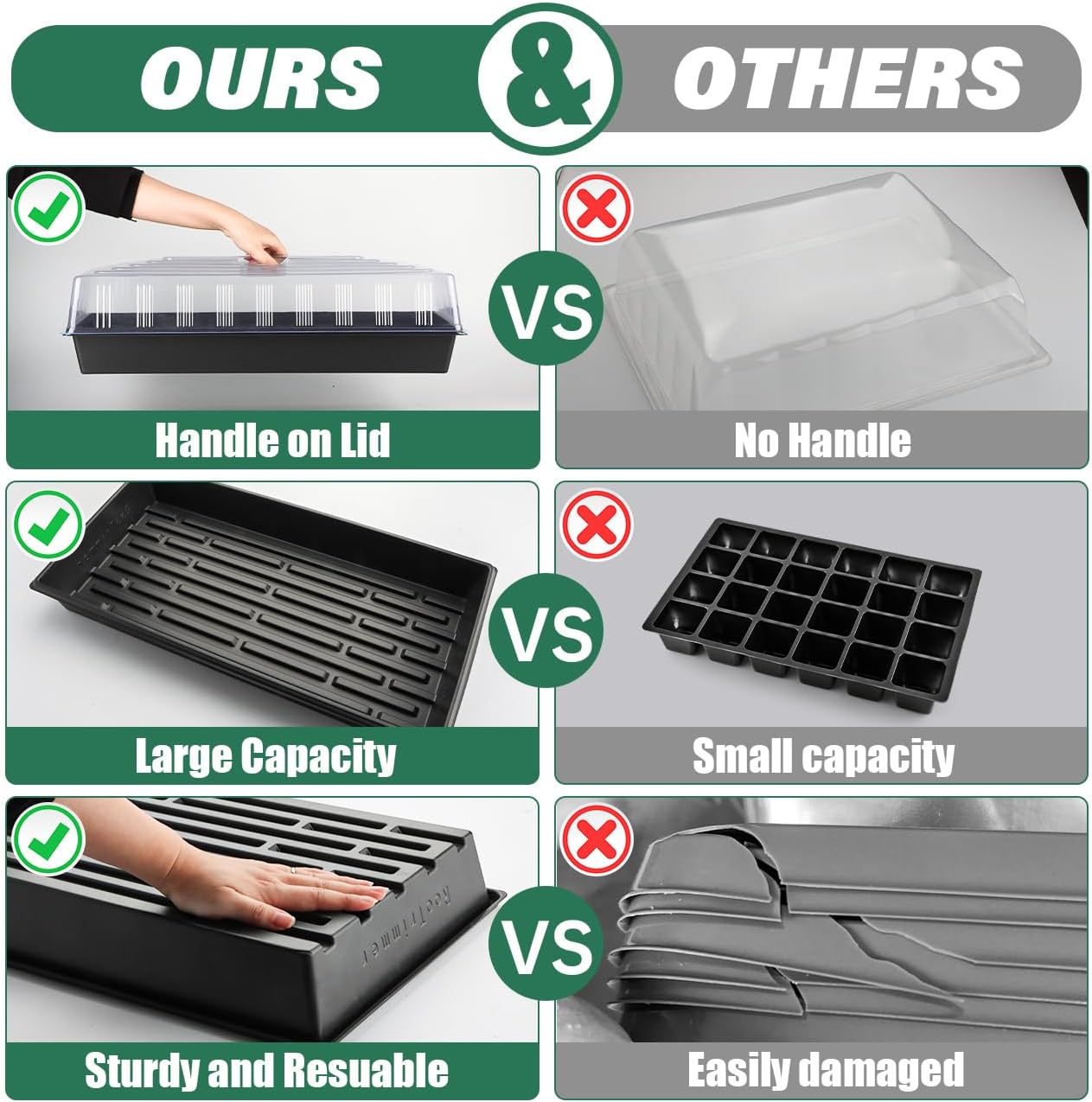 • 【Extra-Large 1020 Tray Design】Perfect for ambitious gardeners! Our oversized 1020-standard trays offer 50% more growing space than typical seedling trays, ideal for starting veggies like tomatoes, peppers, or vibrant flower gardens. The taller 3.6" humidity dome ensures even small trees or deep-rooted plants thrive. Your ultimate solution for fuss-free germination and healthy seedlings from day one!