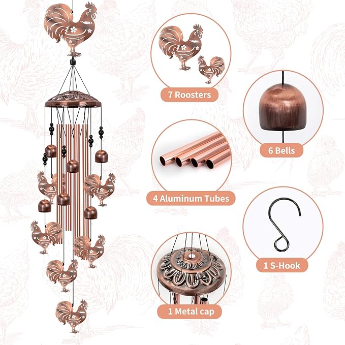 • Rooster Decor: Enhance your outdoor living area with this charming rooster wind chime. Includes large rooster ×1, “S” shaped hook ×1, small rooster ×6, small bells ×6, aluminum tubes ×4, top cover ×1.