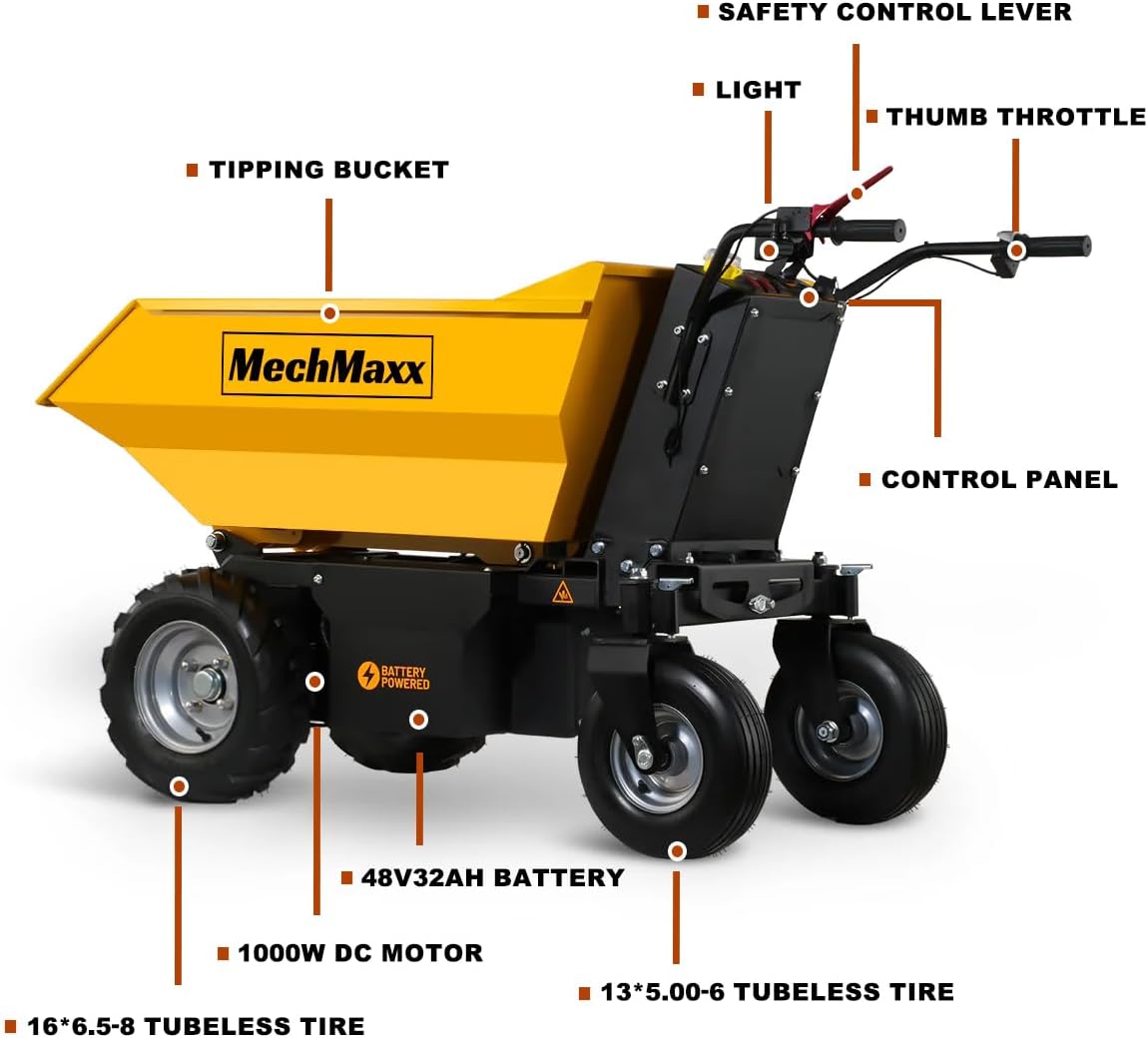 • 【CAPACITY】The safe load capacity is 1100lb, and the maximum load capacity can reach 1500lb.The volume of the tipping bucket can reach 8.2 cu.ft, can carry both solid and semi fluid cargo. Two 16 * 6.5-8 and two 13 * 5.00-6 are both tubeless tires, the hubs are integrally molded, ensure that the tires do not flatten even under such a large load.