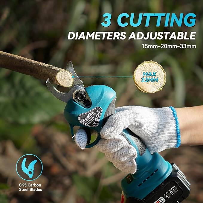 - Professional-Grade Cutting Precision: The SEESII electric pruning shears feature premium SK5 steel blades paired with a responsive 21V brushless motor, delivering exceptional cutting performance. These cordless pole pruning shears make clean, precise cuts through branches up to 1.2 inches thick, promoting healthier plant growth while reducing strain on your hands. Perfect for detailed garden shaping or precise fruit tree maintenance
