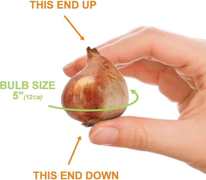 • Product Care Instructions : Plant tulip bulbs in the fall when the ground cools and before the first hard frost. Outside temperature should be about 65 degrees Fahrenheit or cooler. Select a well-drained location that receives full sun to partial shade. Dig a hole 5-6" deep in loosened soil and place bulbs in the hole. Bulbs should be spaced about 4-5” apart. Plant them in the ground with their pointy ends up. Cover with soil and water well so the soil above the bulb settles. Plant tulip bulbs in the fall when the ground cools and before the first hard frost. Outside temperature should be about 65 degrees Fahren… See more