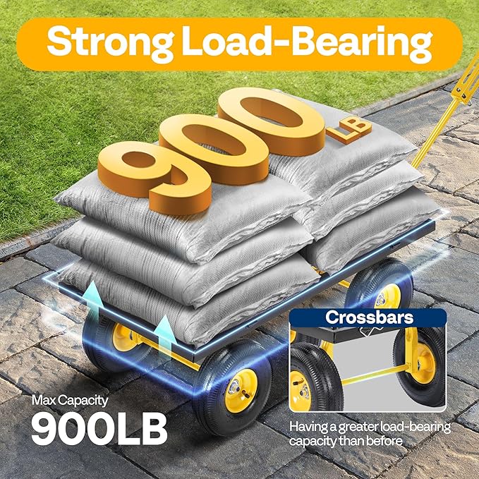 • POWERFUL LOAD AND LARGE CAPACITY: Boasting a generous 38-inch x 20-inch wide heavy-duty, rust-proof iron bed, this cart can effortlessly carry up to 900 lb; The crossbars between two tires improve stability and load-bearing capacity; Whether you use this yard wagon to carry planting tools or equipment, or load wood, it will satisfy all your needs; Note: To prolong its life, long-term heavy loading is not recommended)