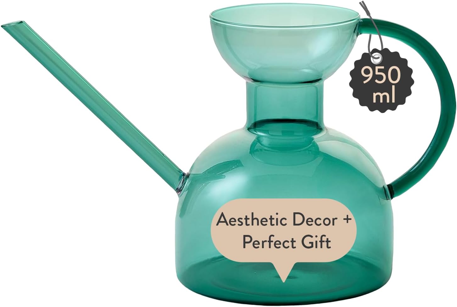 • Elegant Indoor Plant Care: This compact glass watering can holds up to 32 oz of water and is ideal for daily indoor plant care; Lightweight, easy to grip, and handcrafted with a touch of luxury, it's perfectly sized for small pots, planters, and tight corners; Ideal for herbs, succulents, bonsai, and decorative greens; A reliable small watering can for indoor plants that fits seamlessly into modern homes or desk gardens