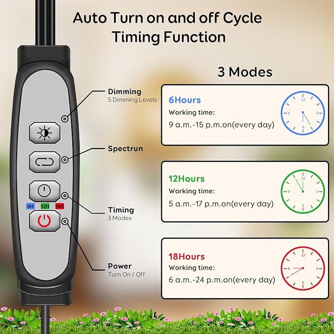 • 【Newly Upgraded Auto Timer 6/12/18Hrs】: This grow light features a circular memory timer with 3 options: 6 hours, 12 hours, and 18 hours. It automatically turns on and off, eliminating the need for daily manual operation. For example,when keeping power ON, if you select 18 Hrs, it will turns ON for 18 hours per 24 hours.The other two timer settings are the same. The 18-hour settiprovides ample light for plants during flowering and fruiting.