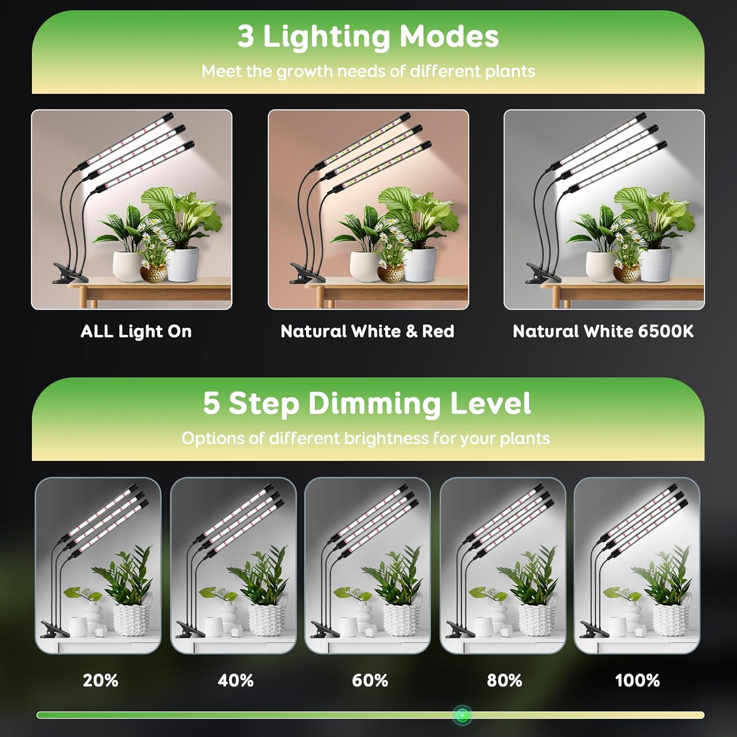 Tri-Heads Grow Lights for Indoor Plants, Full Spectrum Plant Lights for Indoor Growing with Adjustable 360ยฐ Gooseneck, 6/12/18H Timer & Dimming for Seedlings(Pack 2)