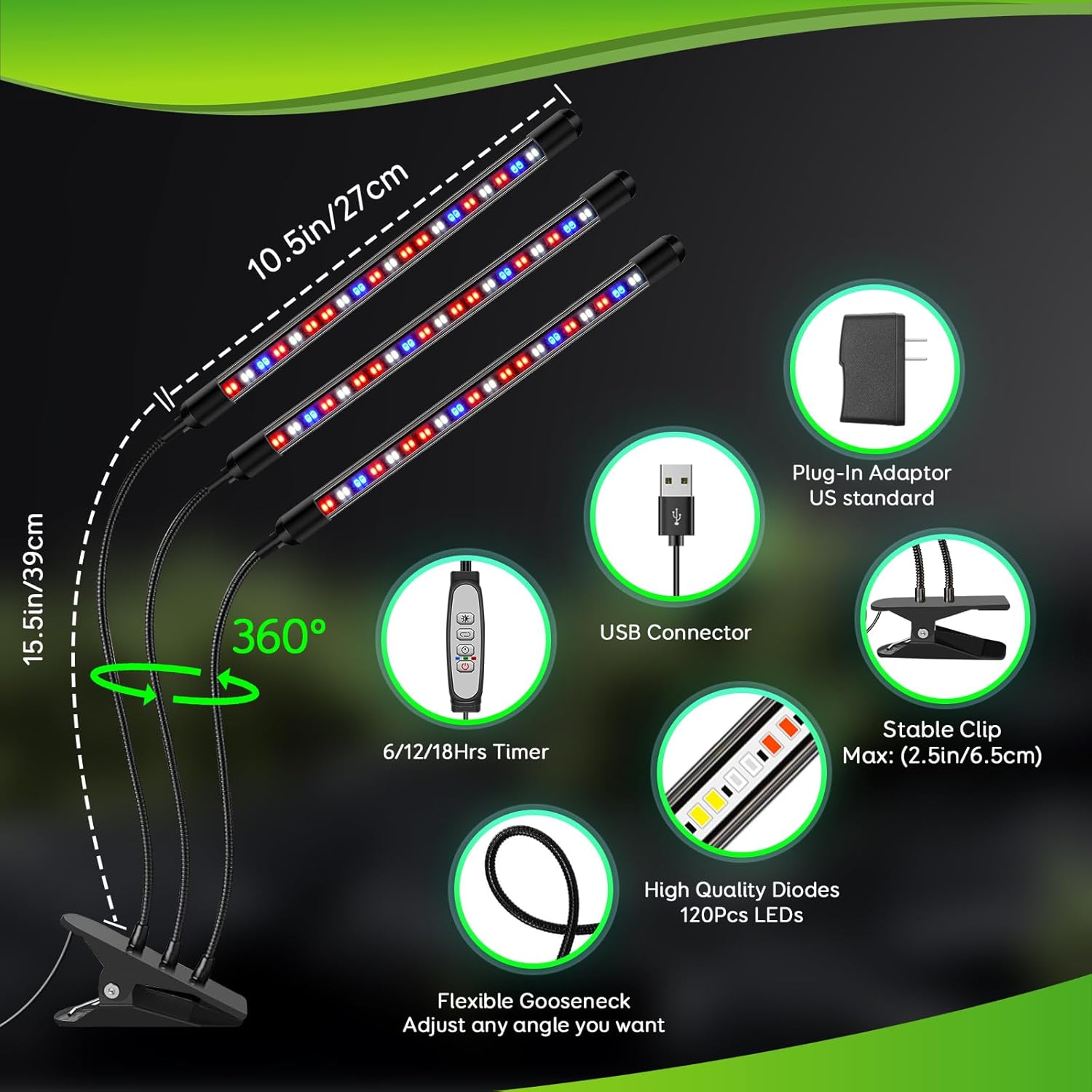 Tri-Heads Grow Lights for Indoor Plants, Full Spectrum with Adjustable 360 Gooseneck, 6/12/18H Timer & Dimming