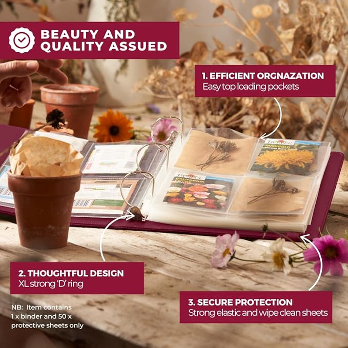 • Fit 200 seed packets in 1 place; large seed binder organizer with 50 pack of 4 pocket sheet protectors (4”x5.5”/pockets)