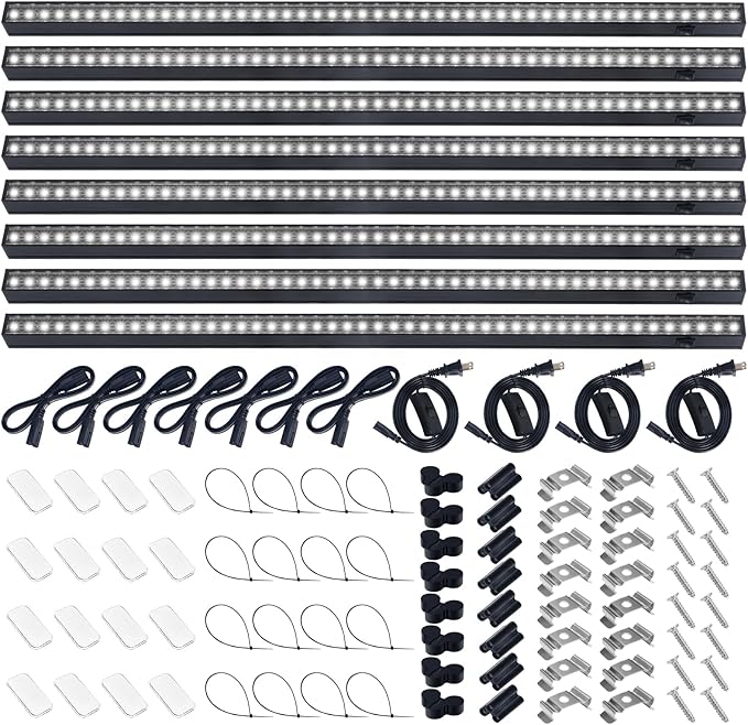 • What You Get: 8 x Barrina T5 Grow Lights, 4 x Power Cords with ON/OFF Switch, 7 x Connecting Cords (20''), 8 x Small Connectors, 16 x Installation Clips, 16 x Magnetic Bars with Double-Sided Tape, 16x Cable Ties, 8 x Dustproof Cap