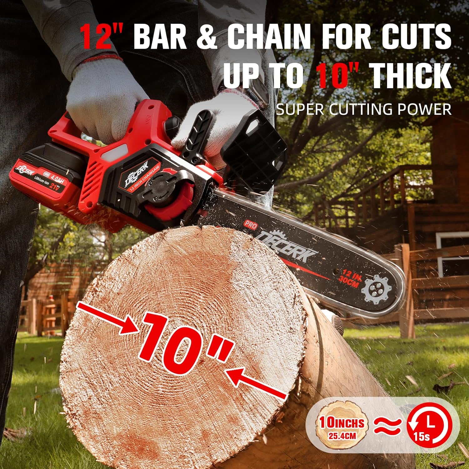 • DUAL SAFETY: This 12-inch cordless chainsaw offers maximum security and ease of use with an instant-stop chain brake and dual safety locks requiring simultaneous activation. The safety system ensures reliable operation, making it ideal for DIY renovations and landscaping
