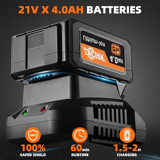 - ๐๐ฐ๐จ ๐๐จ๐ฐ๐๐ซ๐๐ฎ๐ฅ ๐๐๐ญ๐ญ๐๐ซ๐ข๐๐ฌ ๐๐ง๐ ๐๐ก๐๐ซ๐ ๐: featuring GAN-PRO innovative technology and a clear power indicator. Includes a fast charger that fully charges in just 2 hours, providing up to 60 minutes of continuous operation in low-speed mode, perfect for extended yard work sessions