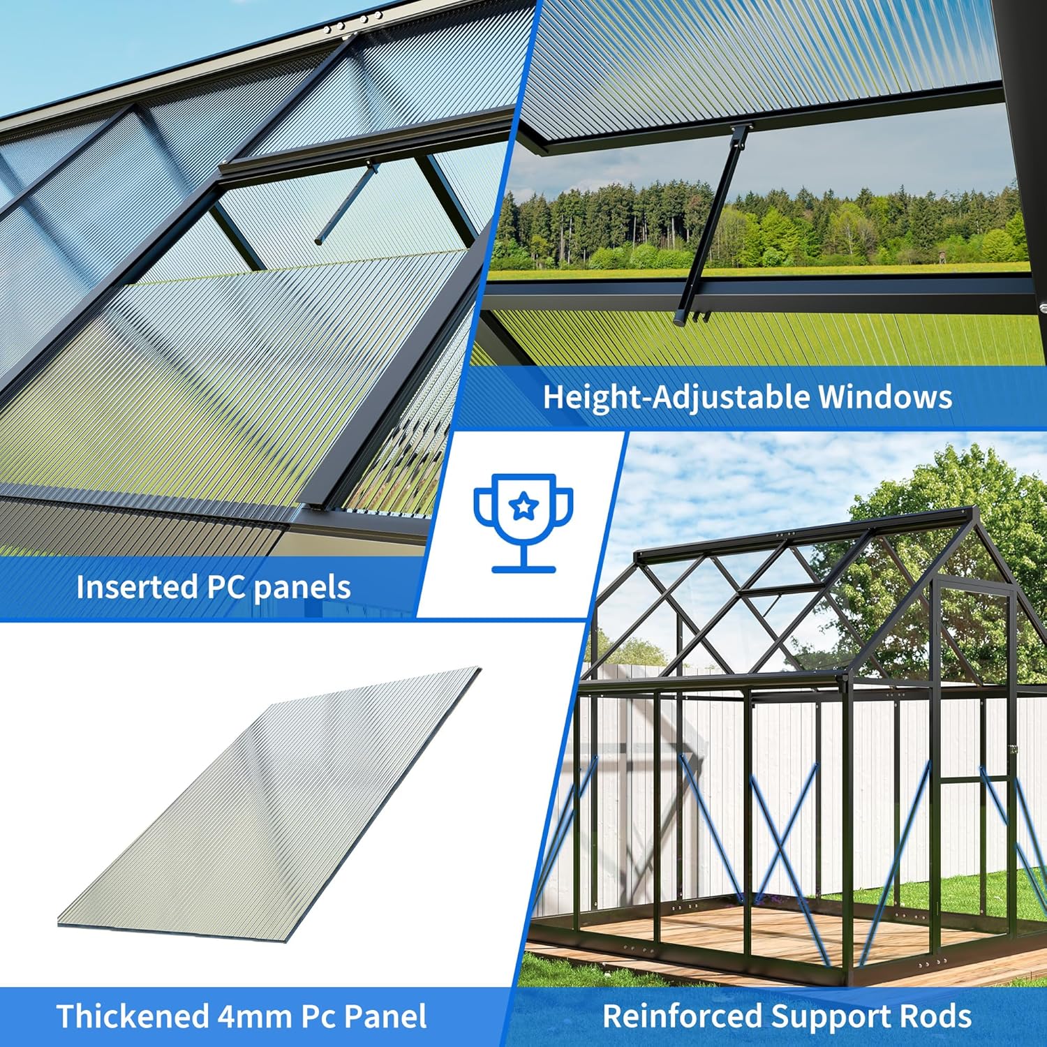 • 【Optimize Sunlight, Resistant to Wind and Snow】The panels of the greenhouse are coated with an anti-ultraviolet coating that isolates UV rays and ensures that the plants are protected from harmful rays while absorbing beneficial sunlight. High-quality polycarbonate panels and reinforced aluminum frames provide a sturdy structure that protects against wind, rain, and snow. The greenhouse can withstand storms and provide year-round protection for plants, giving them a stable place to grow.