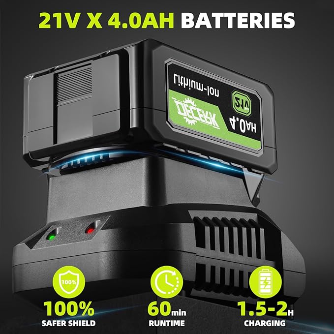 - ๐๐ฐ๐จ ๐๐จ๐ฐ๐๐ซ๐๐ฎ๐ฅ ๐๐๐ญ๐ญ๐๐ซ๐ข๐๐ฌ ๐๐ง๐ ๐๐ก๐๐ซ๐ ๐: featuring GAN-PRO innovative technology and a clear power indicator. Includes a fast charger that fully charges in just 2 hours, providing up to 60 minutes of continuous operation in low-speed mode, perfect for extended yard work sessions