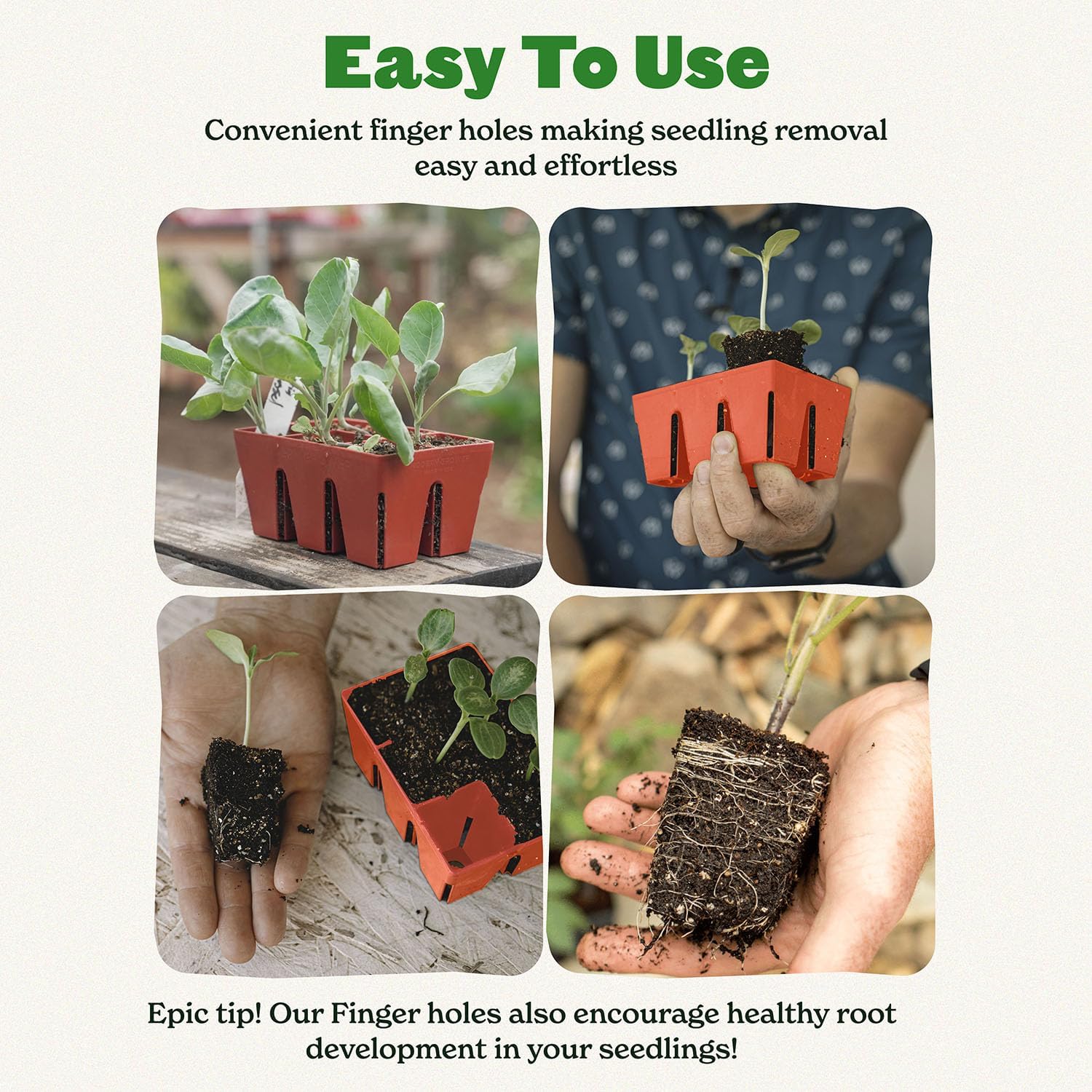 • No more crushed seedlings!: Forget the frustration of digging or using tools to remove seedlings. Our seedling starter trays feature large finger holes on each cell bottom. Simply push gently with your finger, and voila – your seedling pops out effortlessly, ready for transplanting.