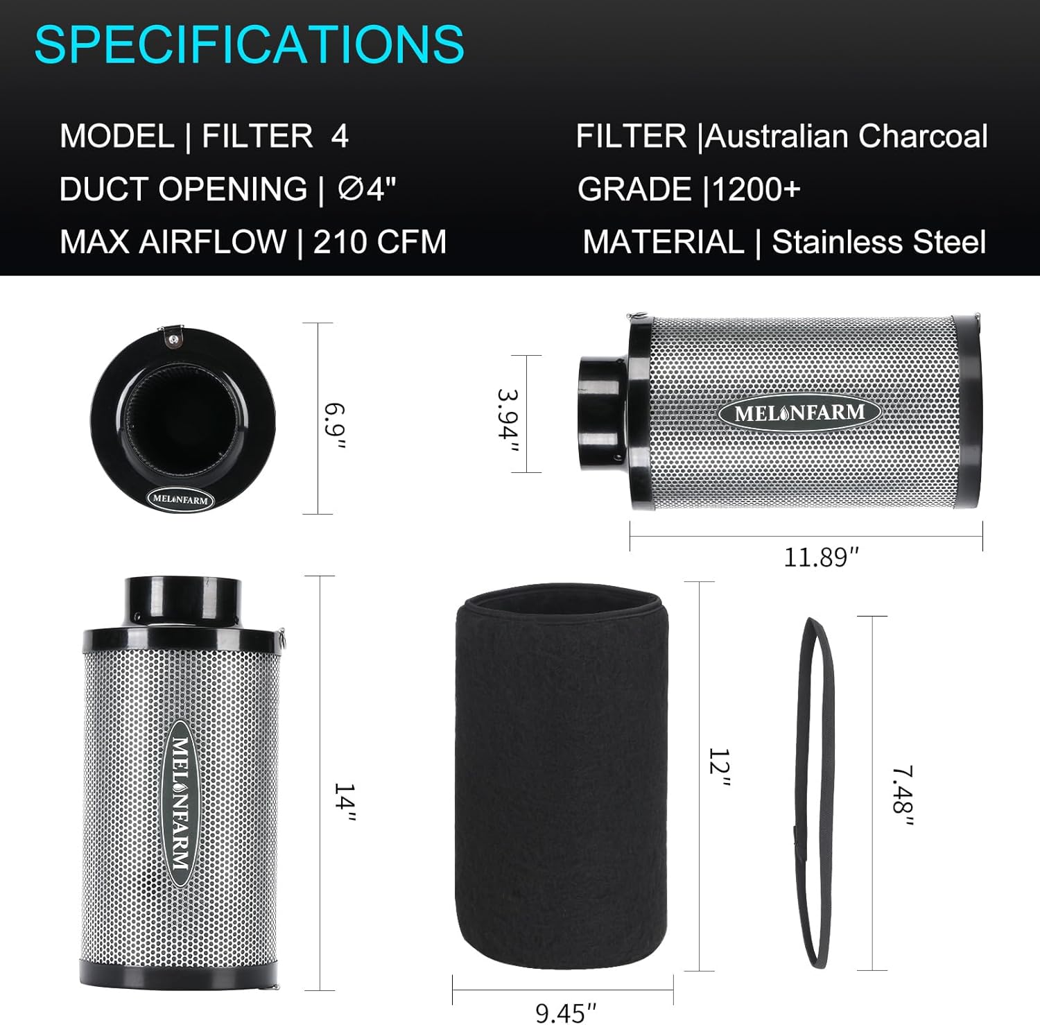 MELONFARM Air Filtration Kit 4", Built-in 14cm Fan Low Nois Carbon Filter with 12-Speed Controller, 8' Ducting & 6" Vent Cover, Cooling & Ventilation System for Grow Tents, Indoor Gardening 4"x12.2"