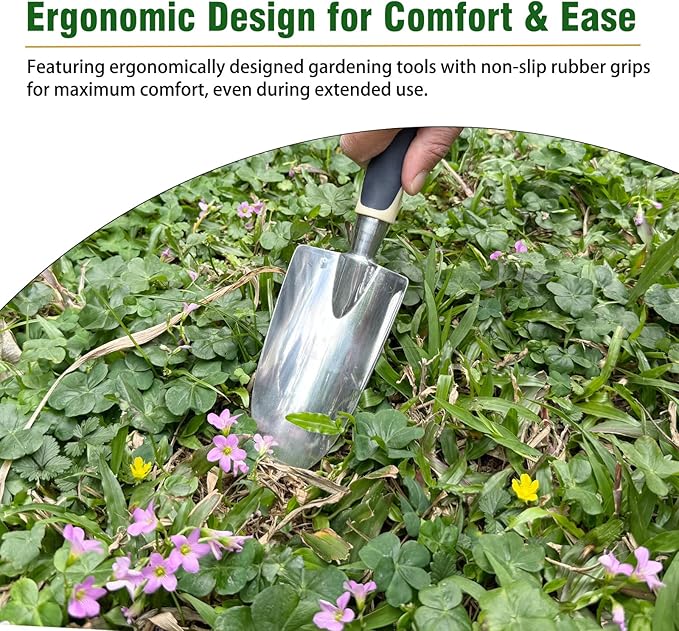 • Premium Quality-- Our gardening tools are made from high-quality aluminum alloy, sturdy and wear-resistant, far surpassing other inferior tools. The ergonomic design with non-slip handles ensures safety and comfort during use, providing you with reliable quality for peace of mind.