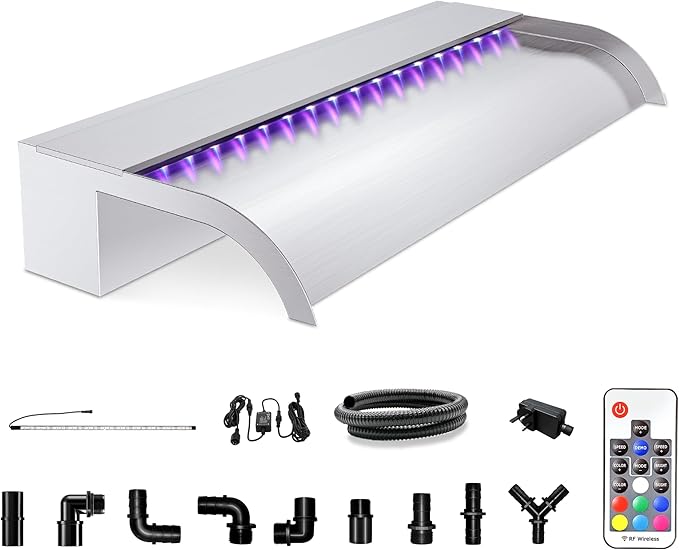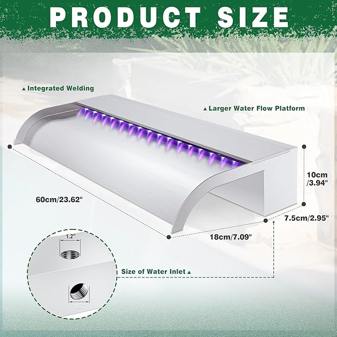 • 【Wider Water Flow Platform & Curved Open Lip Design】The pool waterfall has an 8-inch wide integrated welding water platform, 3.94-inch high water storage tank platform, and 90-degree tilt angle. This design creates a stable, smooth, vertical waterfall for a stunning water display. The soothing sound and sight of the cascad