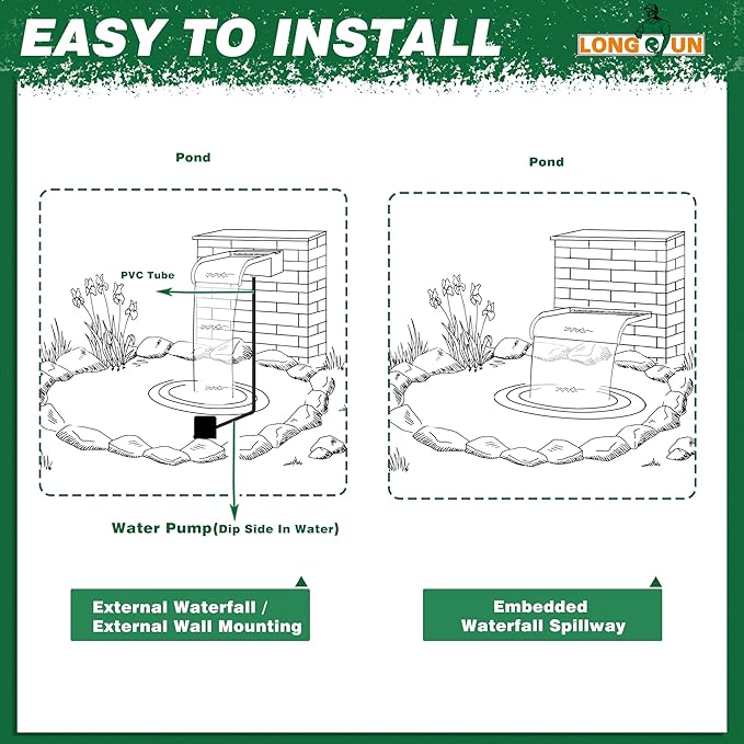 • 【DIY Decoration Pool & Pond fountain】LONGRUN waterfall spillway will make a decorative addition to your garden patio pond or swimming pool, it makes them more elegant, fashionable and beautiful. The color change of LED lights and the gentle sound of water running make your patio more special at night