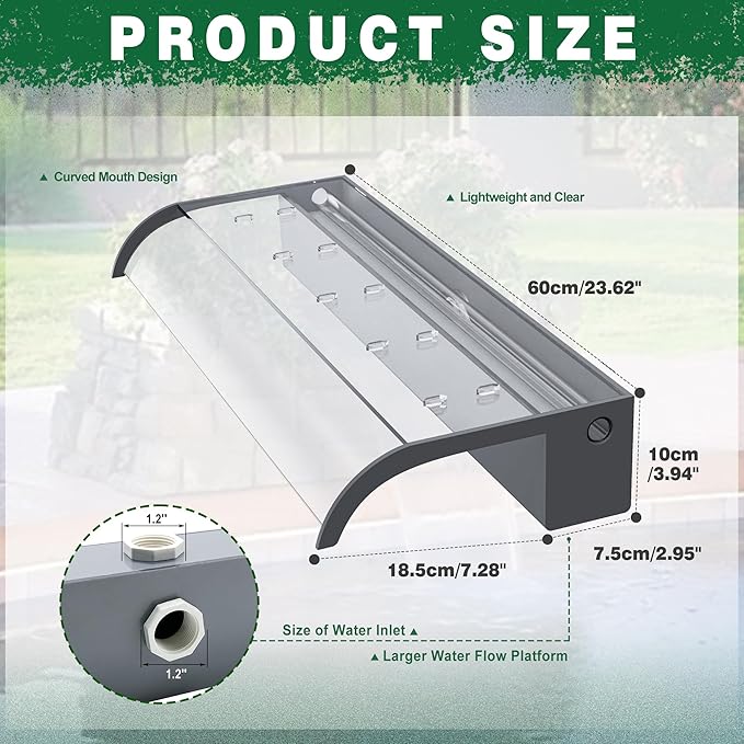 - 【Wider Water Flow Platform & Curved Open Lip Design】The pool waterfall has an 8-inch wide integrated welding water platform, 3.94-inch high water storage tank platform, and 90-degree tilt angle. This design creates a stable, smooth, vertical waterfall for a stunning water display. The soothing sound and sight of the cascading water create a relaxing environment for you enjoy