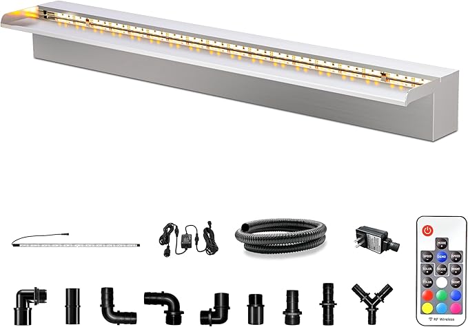 • 【Stainless Steel Waterfall】 The main body of the stainless steel waterfall spillway is welded together using 304 stainless steel, providing durability for long-term use, ensuring rust-proof and no water leakage. The open lip design creates an elegant, invigorating freefalling water effect for your swimming pool or pond