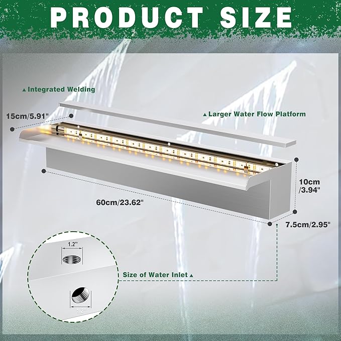 • 【Stainless Steel Waterfall】 The main body of the stainless steel waterfall spillway is welded together using 304 stainless steel, providing durability for long-term use, ensuring rust-proof and no water leakage. The open lip design creates an elegant, invigorating freefalling water effect for your swimming pool or pond