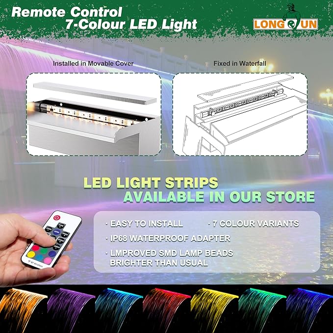 • 【DIY Decoration Pool & Pond fountain】LONGRUN waterfall spillway will make a decorative addition to your garden patio pond or swimming pool, it makes them more elegant, fashionable and beautiful. The color change of LED lights and the gentle sound of water running make your patio more special at night
