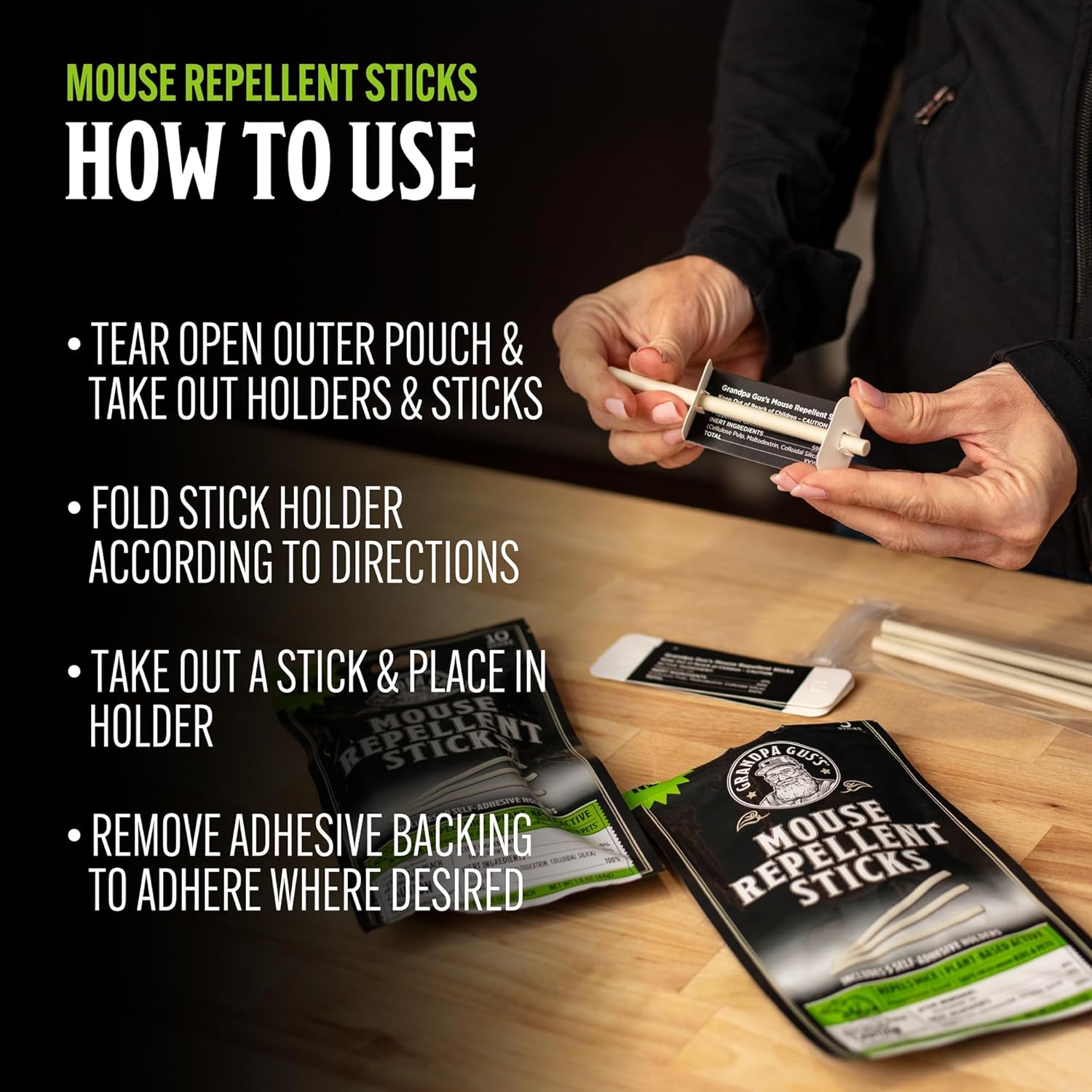 Grandpa Gus's Natural Mouse Repellent Stick, Patented Delivery of Concentrate Peppermint Scent, Plant-Based, Humane Rodent Repellent for Home, Campers & RVs, Pack of 10