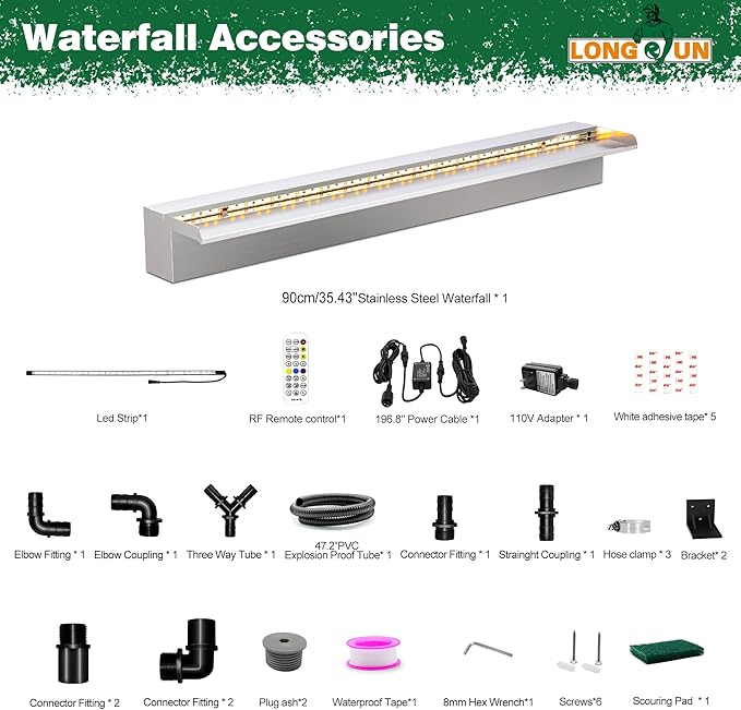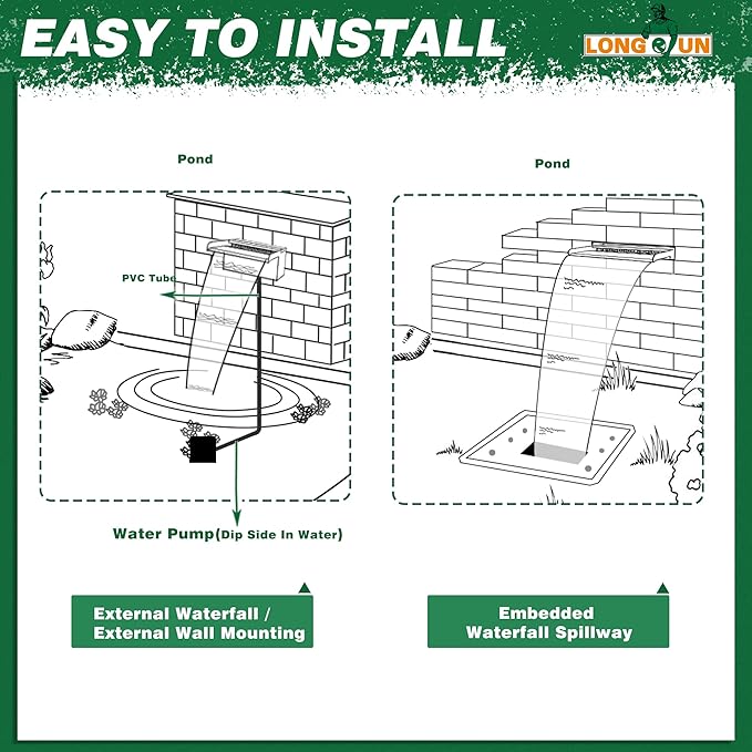 • 【DIY Decoration Pool & Pond fountain】LONGRUN waterfall spillway will make a decorative addition to your garden patio pond or swimming pool, it makes them more elegant, fashionable and beautiful. The color change of LED lights and the gentle sound of water running make your patio more special at night