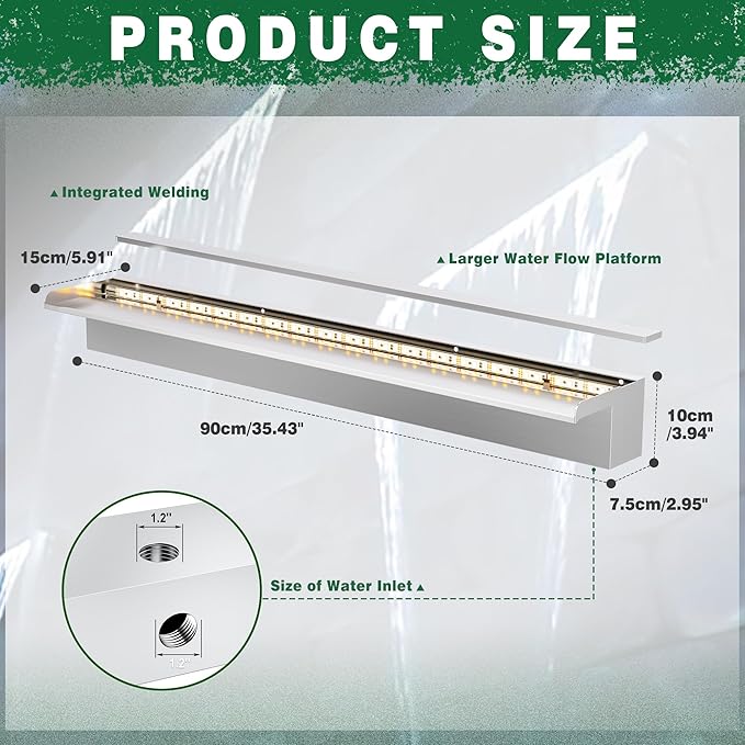 • 【Stainless Steel Waterfall】 The main body of the stainless steel waterfall spillway is welded together using 304 stainless steel, providing durability for long-term use, ensuring rust-proof and no water leakage. The open lip design creates an elegant, invigorating freefalling water effect for your swimming pool or pond