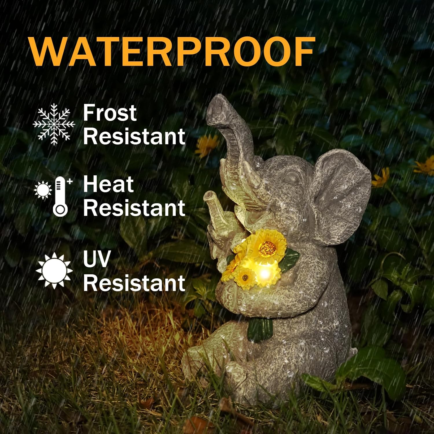 • Waterproof Garden Decor: The outdoor figurine light is crafted from durable, waterproof resin and coated with UV-resistant finish. It withstands varying weather conditions without cracking and fading. The solar garden elephant sculptures measures 5.51"L x5.71"W x 9.06"H, perfect for garden yard decorations, illuminating your backyard, lawn, pond, balcony, and flower beds, adding a touch of warmth and whimsy to your home.