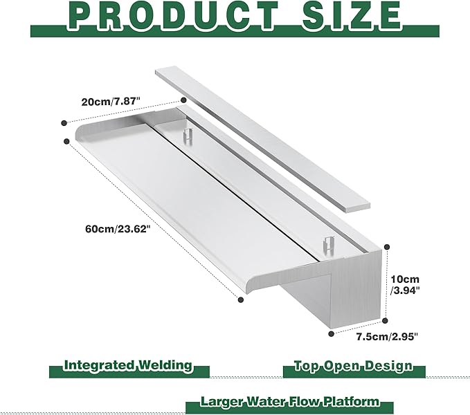 - 【Anti-Rust Spillway Waterfall】- The main body of this stainless steel spillway waterfall is welded together using 304 stainless steel for stable long-term use, featuring an top open lip design that creates elegant, invigorating, freefalling water effects to add a decorative touch to ponds and pools, letting you enjoy the relaxing sounds of water for a sense of calm and well-being. LED light strips not included, but available separately.